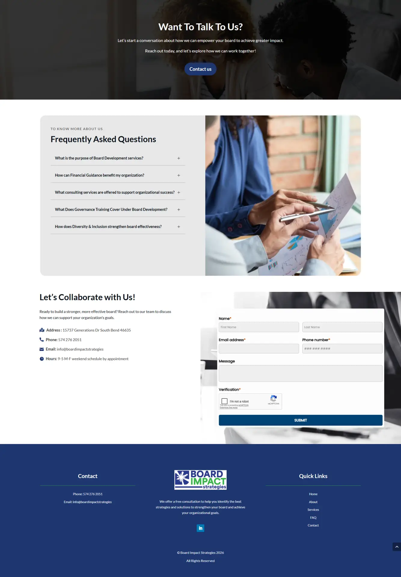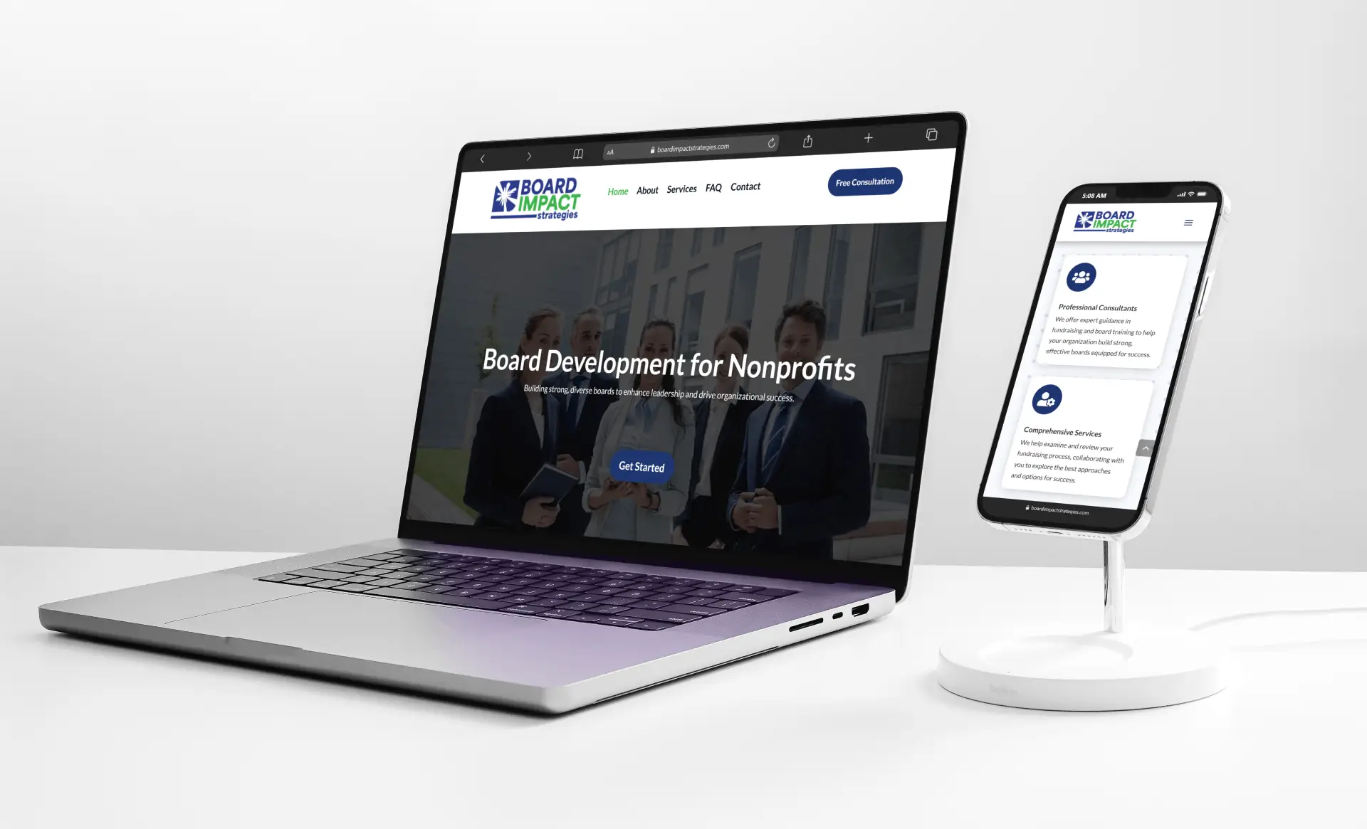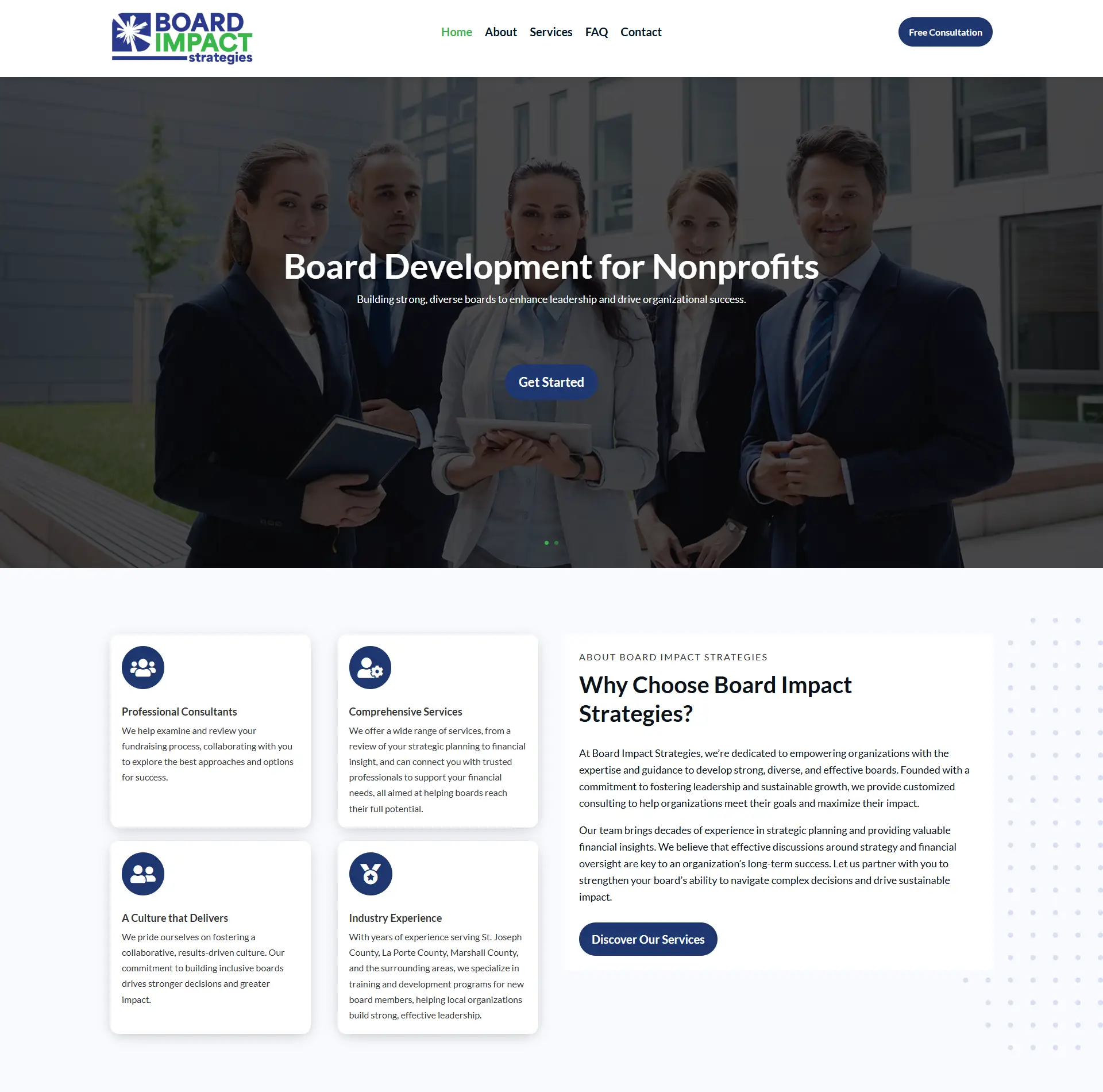 The absence of an existing website limited visibility and credibility, making it difficult to clearly communicate services and attract nonprofit organizations seeking guidance in building strong, diverse boards.