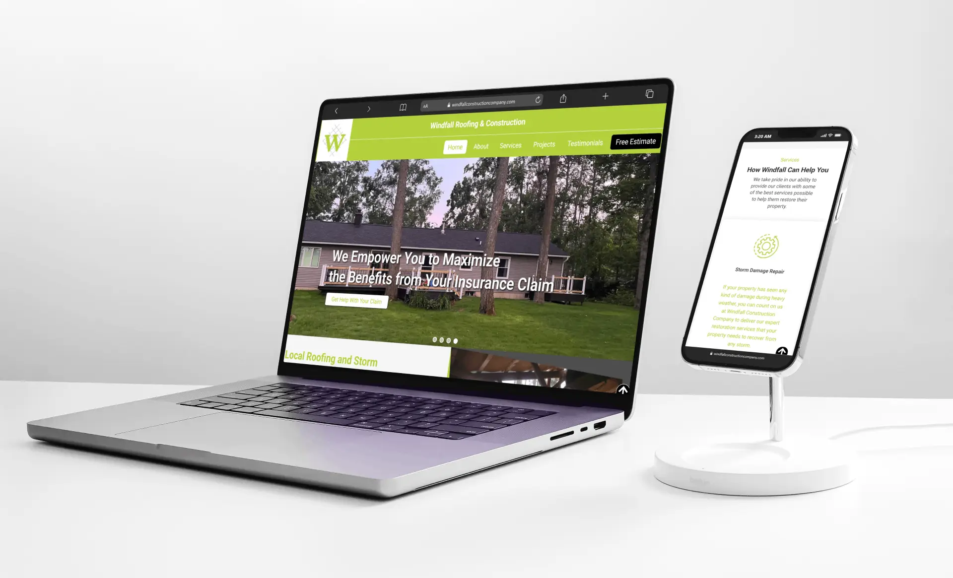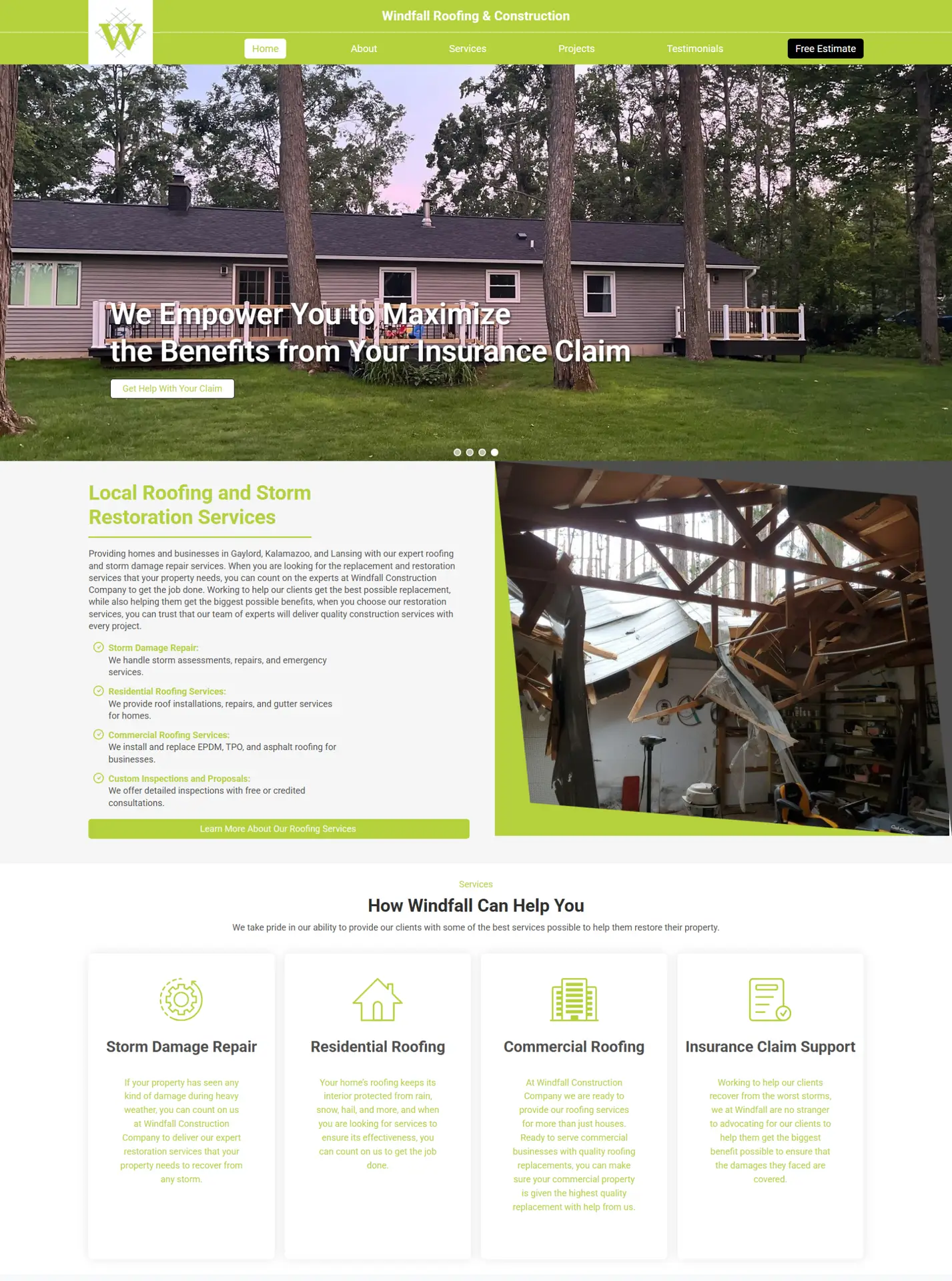 We simplified messaging and structured all services for clarity, highlighting roofing, storm damage repair, and inspections. A free estimate promotion and portfolio showcase were added to improve trust and guide users toward taking action.